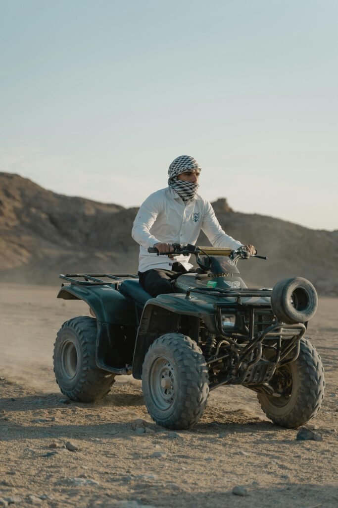 Start your adventure with a pick-up service from your Hurghada hotel. Head to the desert for a briefing from your guide and prepare for your adventure. Don a scarf and face mask and get on a quad bike.